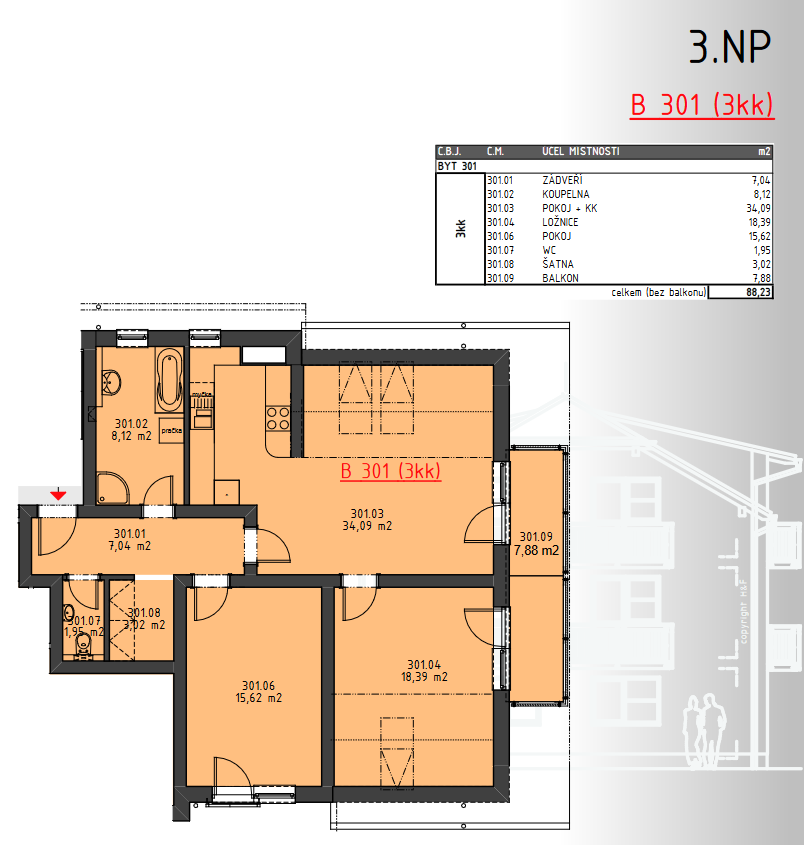 Nabízíme k prodeji bytovou jednotku č. 301 o velikosti 3+KK s vlastním sklepem a parkovacím stáním v nově vzniklém obytném souboru Nové Město v Trhových Svinech.